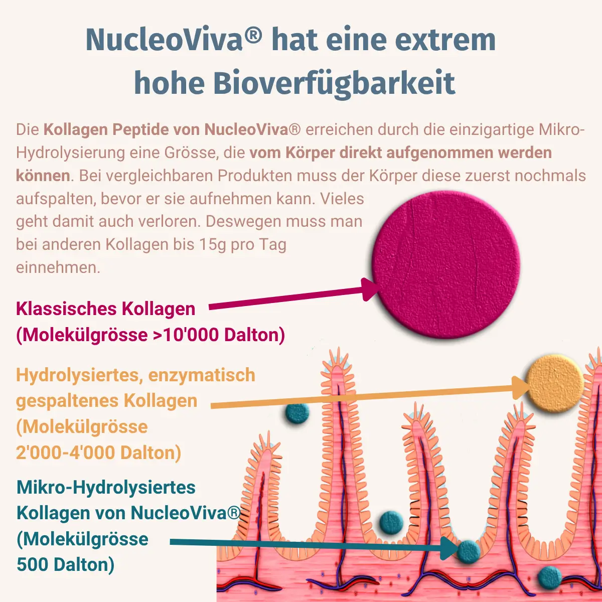 Conventional collagen has a molecular size of around 2,000–5,000 daltons, which means that it must first be broken down into smaller components in the digestive tract before it can be absorbed by the body. High-quality, bioactive collagen peptides supply the bones, tendons, cartilage and muscles with important nutrients that stimulate cell functions.
