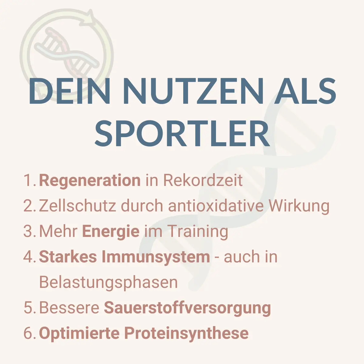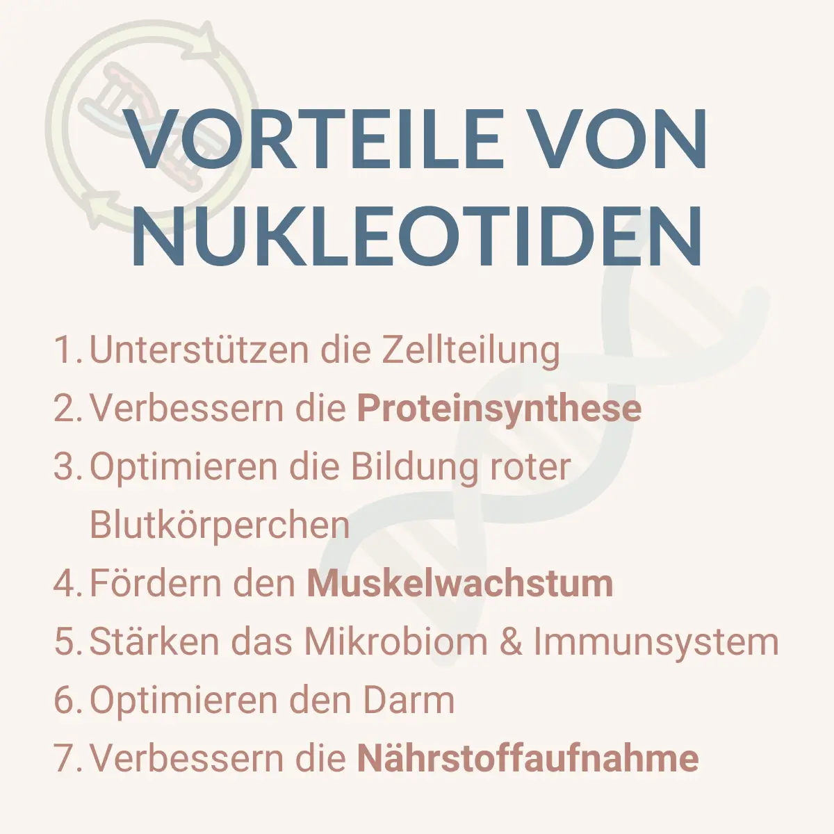 Nucleotides are indispensable for these processes: they provide the building blocks for every new cell. So if you want more strength, faster recovery and better performance, you need sufficient nucleotides as a foundation.